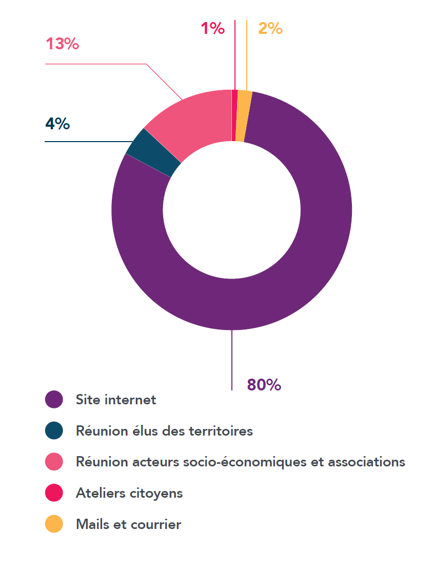 1085 contributions ont été reçues sur la période de dialogue territorial, réparties de la manière suivante. Voir visuel ci-contre.